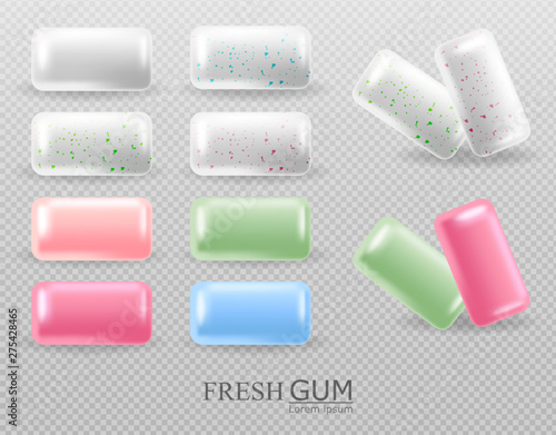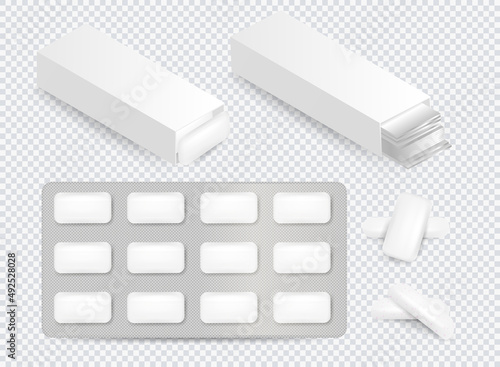 Белый пустой блокнот и набор макетов упаковки жевательной резинки, зеленые листья мяты, падающие жевательные резинки, векторная иллюстрация, изолированная на прозрачном фоне.