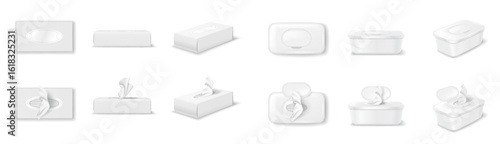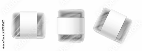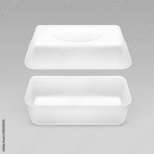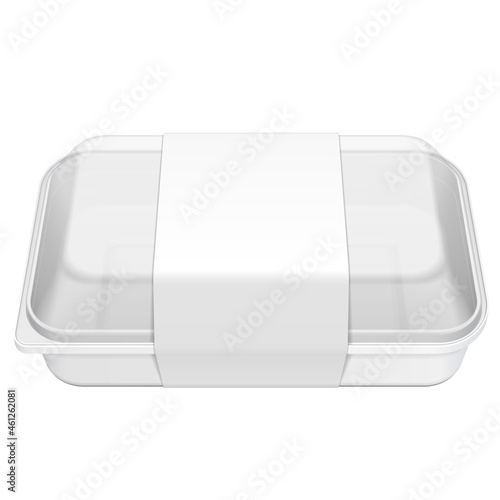 Набор макетов пластиковых коробок для ланча. Векторная реалистичная иллюстрация белого пустого пластикового контейнера для пищевых продуктов, изолированного на белом фоне.