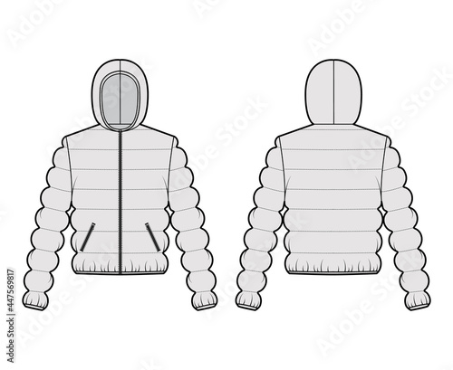 Набор макетов белой пуховой куртки, векторная иллюстрация, изолированная на прозрачном фоне. Реалистичный современный пуховик с капюшоном, стеганое пальто, вид спереди и сзади.