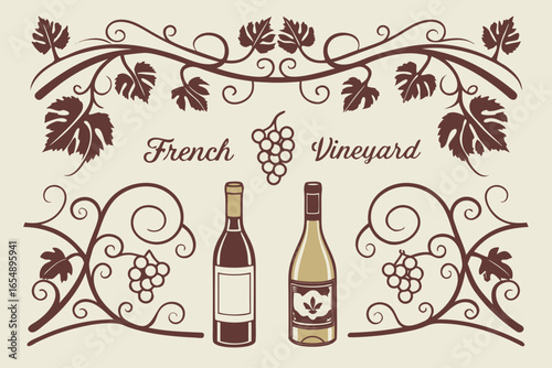 Реклама белого вина. Векторный реалистичный макет упаковки бутылки из винного стекла, нарисованные чернилами бутылки и бокалы для вина, штопор, пробковая пробка, гроздья винограда, яблоко, клубника и сыр.