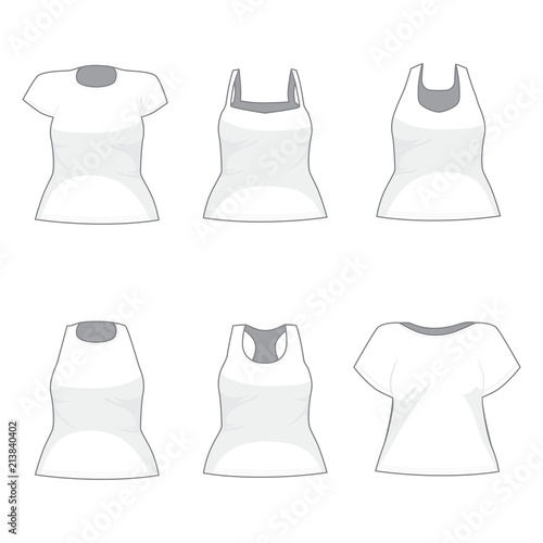 Макет белого женского спортивного бюстгальтера или укороченного топа и шорт, векторная иллюстрация, вид спереди, сзади и сбоку. Мода на спортивную одежду, шаблон тренировочной одежды.