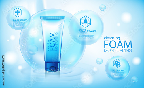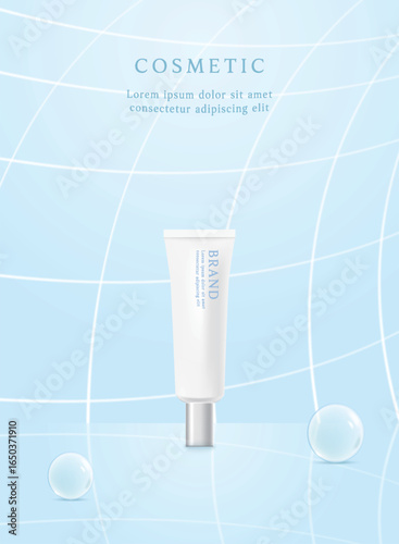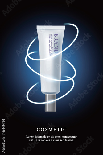 Рекламный плакат отбеливающей зубной пасты. Векторный реалистичный макет упаковки зубной пасты с вашим брендом на синем фоне с белым сверкающим зубом и копировальным пространством.