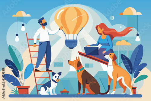 Альтернативное производство чистой энергии, векторная иллюстрация. Солнечные батареи и ветряные турбины, вырабатывающие электроэнергию из возобновляемых источников, таких как солнце и ветер, мужские и женские персонажи.