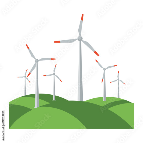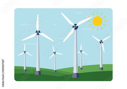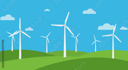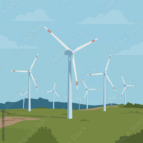 Ветроэнергетическая установка и завод. Ветряные турбины. Промышленная концепция зеленой энергетики. Векторная иллюстрация в плоском стиле. Фон ветроэлектростанции. Возобновляемые источники энергии.