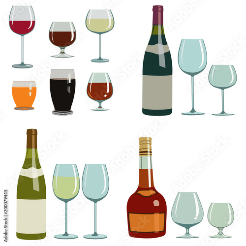 Вектор вина и коньяка. Мультяшный набор для бара с напитками. Стеклянная бутылка, бокал для вина и сладкая закуска выделены на белом фоне. Алкогольный напиток для романтического свидания, празднования вечеринки и поздравления с праздником