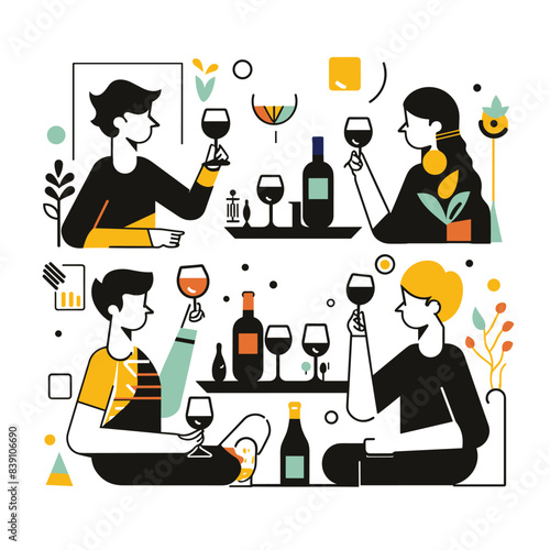 Композиция "Время вина" с официантом, разливающим напиток, бокалами для ликования, открытой бутылкой, сырной закуской, гроздью винограда и человеком, дегустирующим натуральный ароматный напиток, векторная иллюстрация
