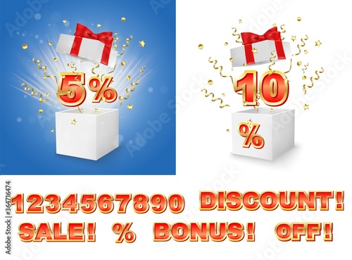 Белая открытая коробка со словом "Победа", золотой серпантин и взрыв конфетти, векторная изолированная иллюстрация. Подарочная коробка победителя для баннера, плаката и т.д.