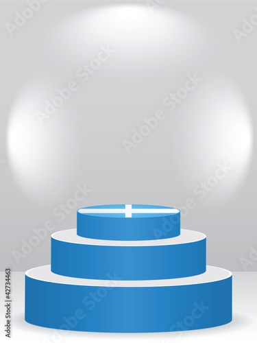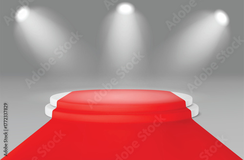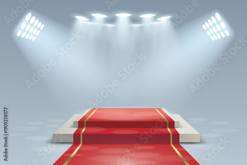 Пьедестал почета победителя, векторная реалистичная иллюстрация. Белый пьедестал победы с красной ковровой дорожкой, освещенной напольными прожекторами. Сцена для церемонии награждения.