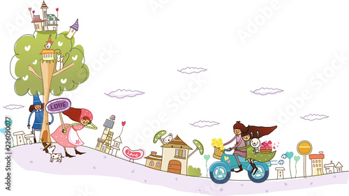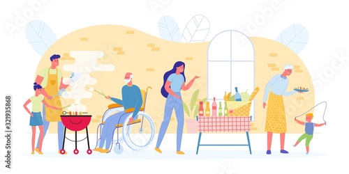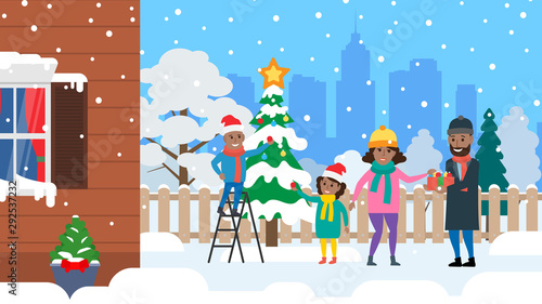Зимние мероприятия, концепция рождества векторная иллюстрация в плоском стиле. Заснеженная улица, городская жизнь. Люди играют в снежки, лепят снеговика, покупают элементы дизайна рождественской елки.