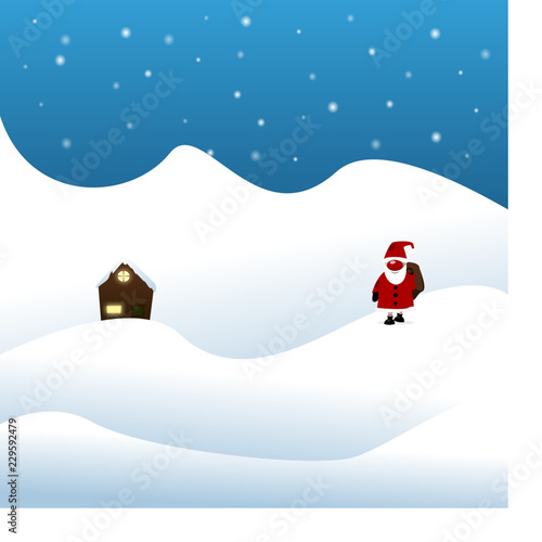 Зимний фон с векторной иллюстрацией катания Санта Клауса на лыжах в стиле оригами, вырезанном из бумаги. Шаблон дизайна рождественской открытки с волшебным забавным персонажем, катающимся на санках вниз по склону в заснеженном лесу