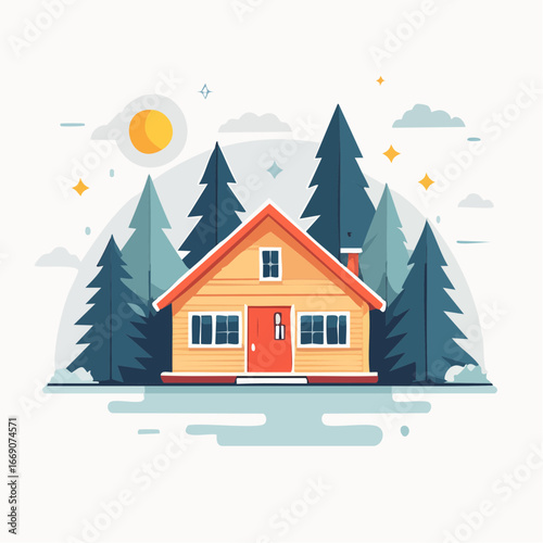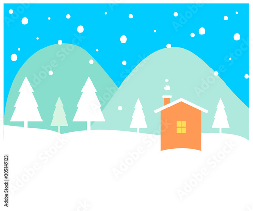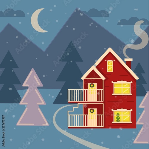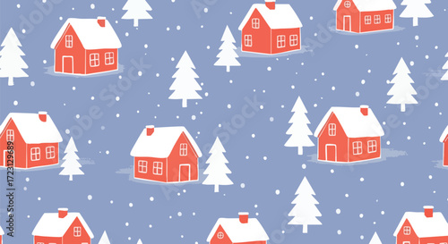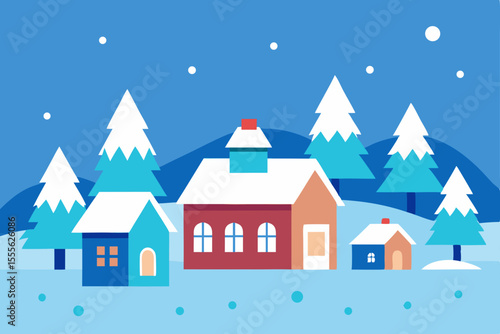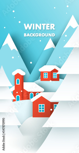 Зимний фон со снежной деревенской векторной иллюстрацией в стиле оригами, вырезанной из бумаги. Рождественская пейзажная открытка с долиной чудес и уютными домиками под снегом шаблон дизайна