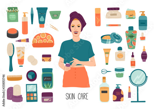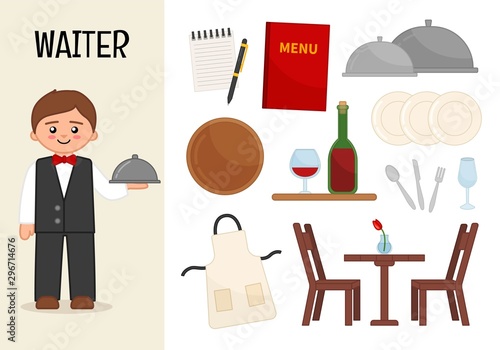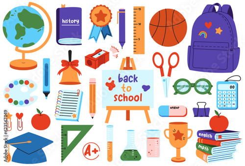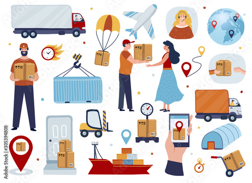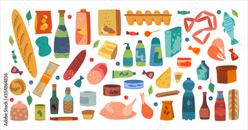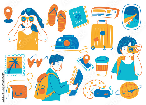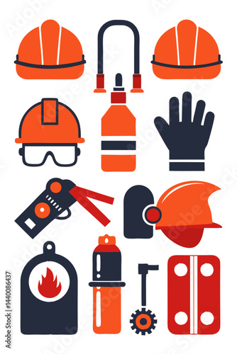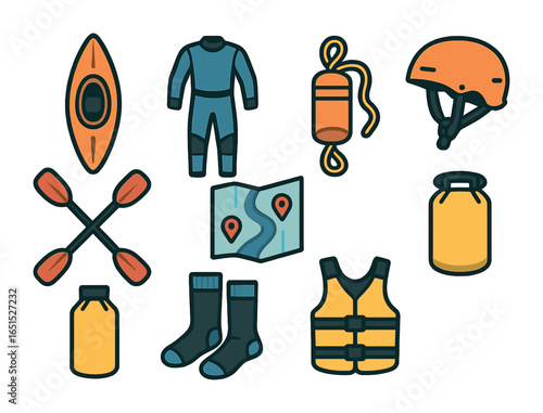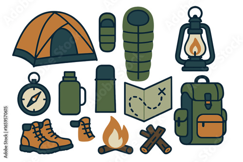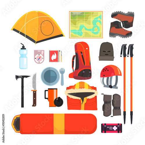 Зимнее походное снаряжение, плоская векторная изолированная иллюстрация. Снаряжение для горных путешествий, скалолазания и зимнего треккинга. Теплая одежда, рюкзак, компас, походная палатка, лыжи, спальный мешок, карта, походные ботинки и т.д.
