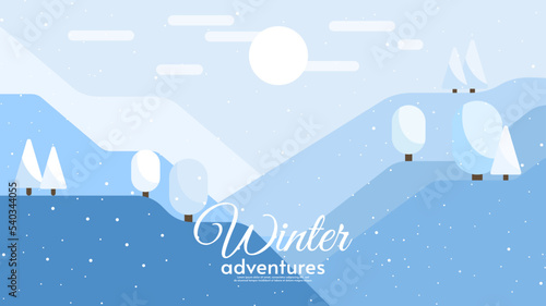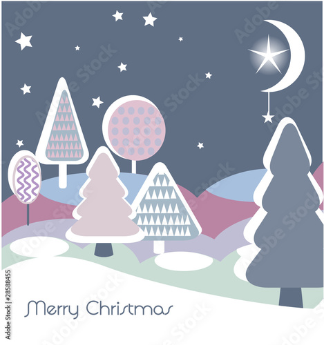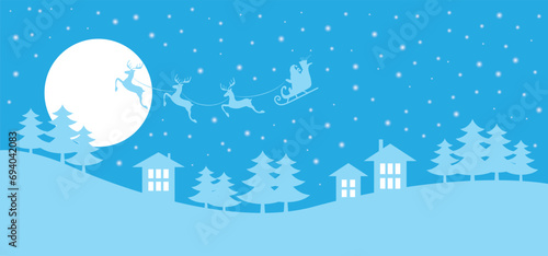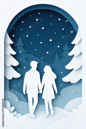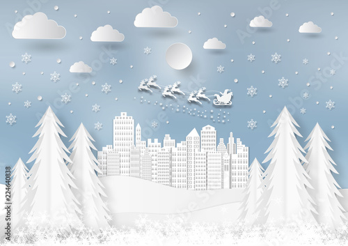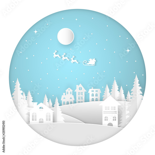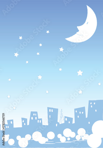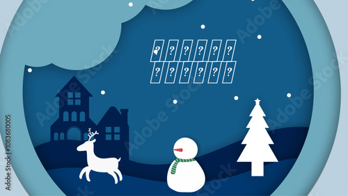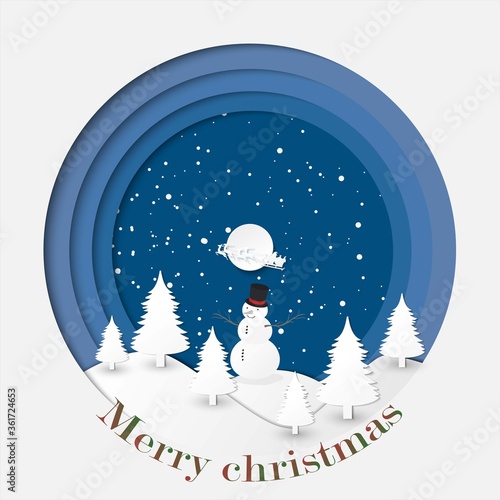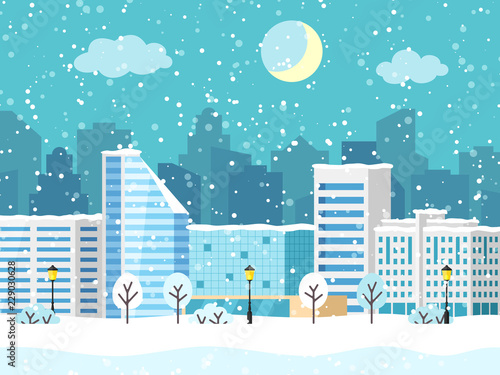 Зимний ночной городской пейзаж с полумесяцем, зданиями, заснеженными деревьями, снеговиком, векторная иллюстрация в стиле современного бумажного искусства. Композиция с Новым годом и Рождеством для открытки, веб-баннера.