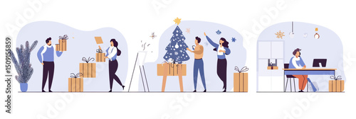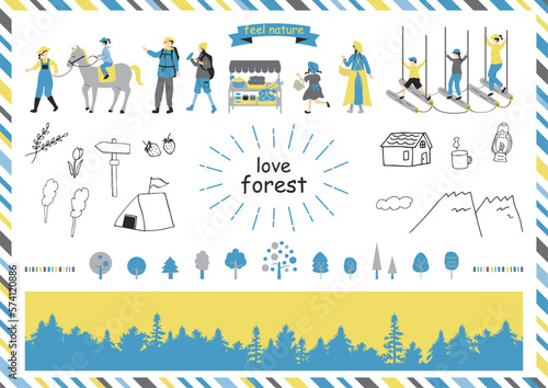 Набор зимних горнолыжных курортов, векторная изолированная иллюстрация. Герои мультфильмов о лыжниках и сноубордистах, канатная дорога, горный склон, отель, прокат лыжного и сноубордического снаряжения. Зимние путешествия на свежем воздухе.
