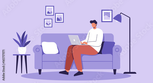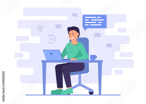 Человек, работающий на ноутбуке, сидя на скамейке с приветственным пузырьком сообщения, векторная плоская изолированная иллюстрация. Бесплатная общественная зона доступа Wi-Fi, концепция технологии беспроводной сети для веб-баннера, страницы веб-сайта и т.Д