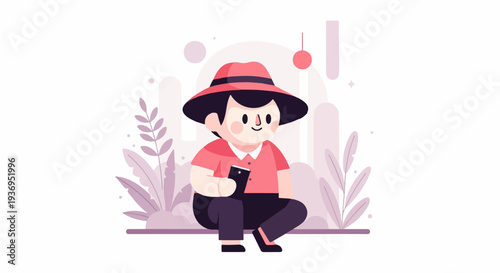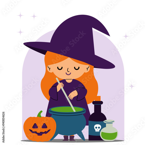 Ведьма готовит яд в векторном мультфильме на Хэллоуин. Котел с волшебным зельем и милая красивая девушка-волшебница в шляпе и костюме произносит заклинание перед кипящим котлом, выделенным на белом фоне