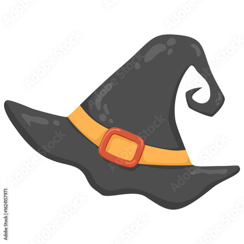 Черная шляпа ведьмы с пряжкой и красной лентой. Значок костюма волшебника на Хэллоуин, выделенный на белом фоне
