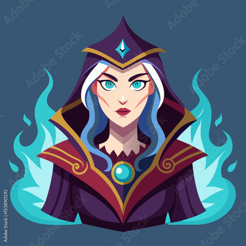 Волшебник, маг, готовящий зелье в котле и читающий книгу заклинаний, плоская векторная иллюстрация. Чернокнижник, колдун, старый бородатый мужчина в синей мантии волшебника, шляпе. Тайна, фантазия, колдовство, волшебные заклинания Мерлина.