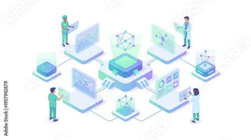 Женщина, покупающая искусство NFT, несменяемый токен, плоская векторная изометрическая иллюстрация. Технология блокчейна цифрового криптоискусства.