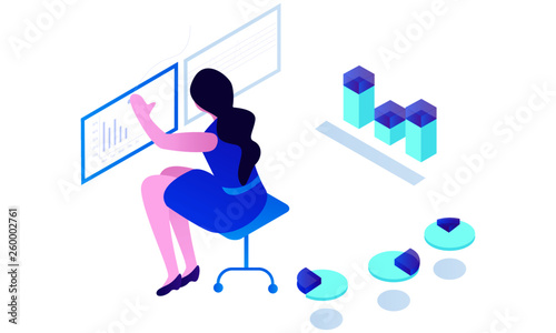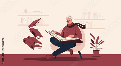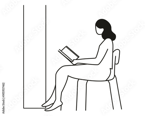 Женский персонаж читает книгу, сидя на табурете, векторная иконка изолирована на белом фоне.