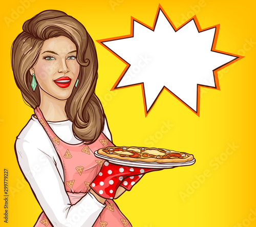Женщина готовит пиццу дома. Векторная иллюстрация в стиле ретро-комиксов поп-арт.