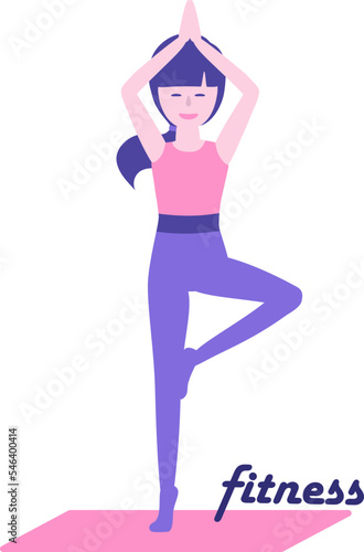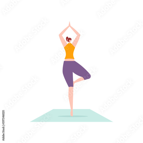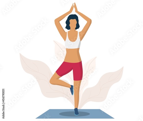 Женщина, занимающаяся йогой, плоская векторная иллюстрация. Поза йоги на дереве или врикшасана. Тренажерный зал, здоровый образ жизни.