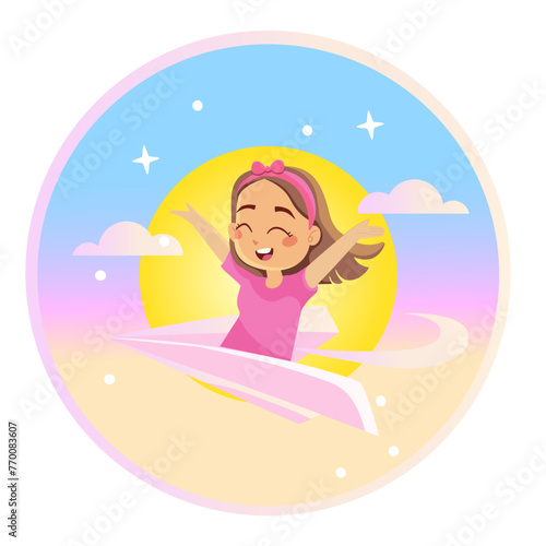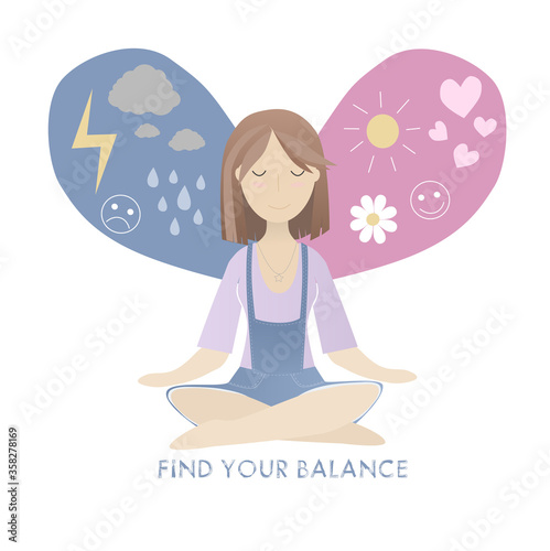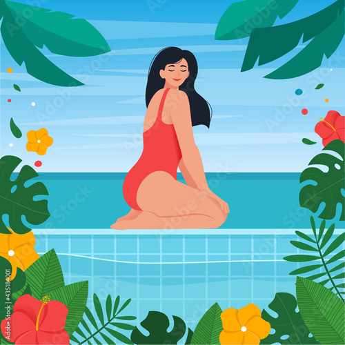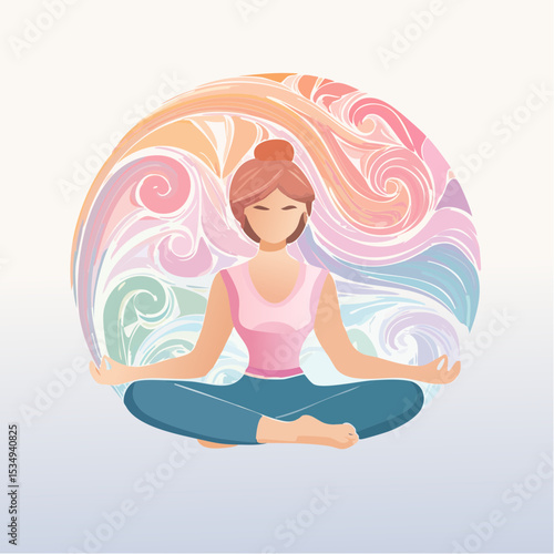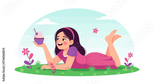 Женщина занимается йогой на улице в парке. Иллюстрация концепции летнего времени. Векторный шаблон дизайна веб-сайта. Молодая девушка наслаждается своим мороженым и ходит по стите. Летние выходные.
