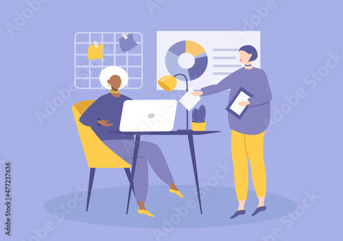 Деловая женщина, дающая чашку кофе усталой измученной девушке, работающей на компьютере, сидящей за столом в офисе внутри батареи с низким энергопотреблением, плоская векторная иллюстрация. Тяжелая работа, эмоциональное выгорание, усталость.