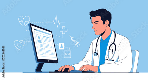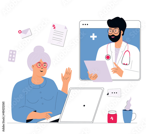 Женщина, проводящая онлайн-консультацию с врачом, векторный значок, изолированный на белом фоне
