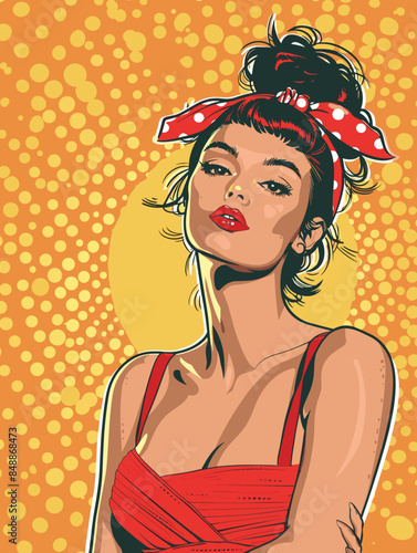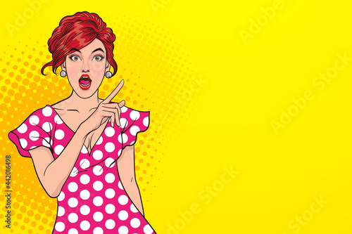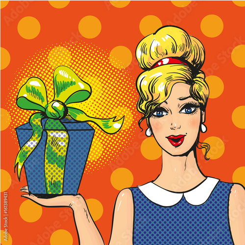 Векторная иллюстрация красивой блондинки, держащей подарочную коробку. Симпатичная женщина с подарком в стиле ретро-комического поп-арта.