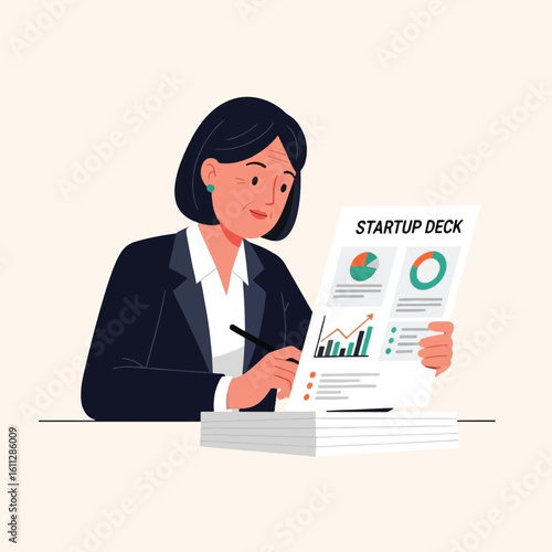 Женщина держит в руках бумагу с векторным значком аналитической диаграммы, выделенным на белом фоне. Финансовый отчет о бизнесе или информационная концепция оценки кредитоспособности