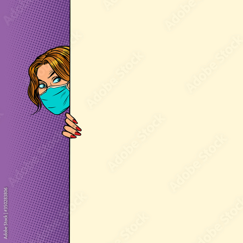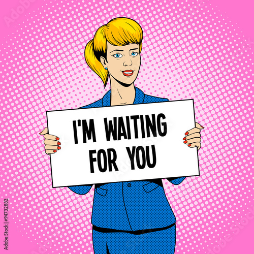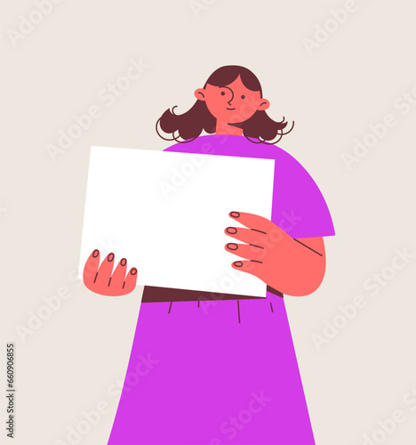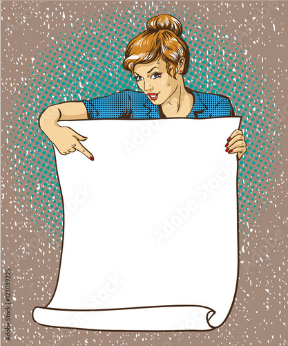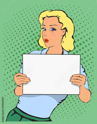 Женщина держит пустой плакат из белой бумаги. Векторная иллюстрация в стиле ретро в стиле поп-арт. Поместите свой собственный текстовый шаблон.
