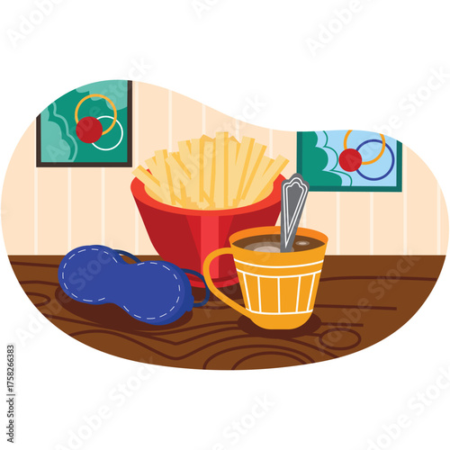 Женщина в депрессии и стрессе ест фаст-фуд дома. Завтрак, картофель фри, кофе. Иллюстрация концепции. Векторный шаблон дизайна веб-сайта.