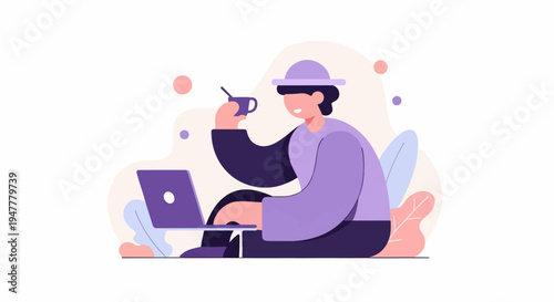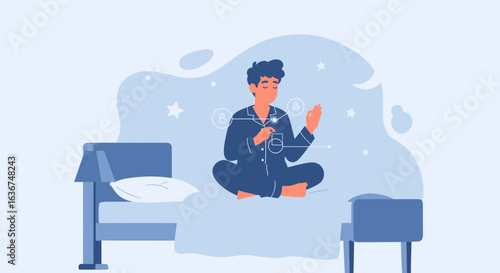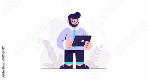 Человек в наушниках, слушающий аудиопрограммы на планшетном компьютере, плоская векторная иллюстрация. Мужской персонаж слушает музыку, радио, подкаст, аудиокнигу. Подкастинг, онлайн-радио, потоковое вещание.