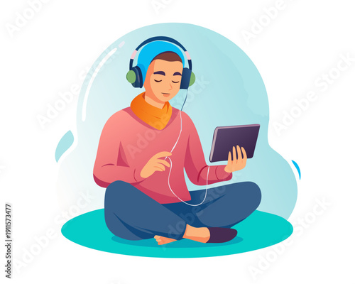 Женщина в наушниках слушает аудиопрограммы на портативном компьютере, плоская векторная иллюстрация. Девушка слушает музыку, радио, подкаст, аудиокнигу. Подкастинг, онлайн-радио, потоковое вещание, широковещательные СМИ.