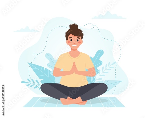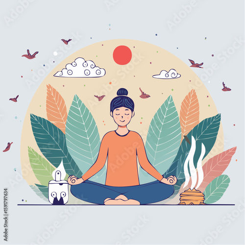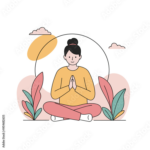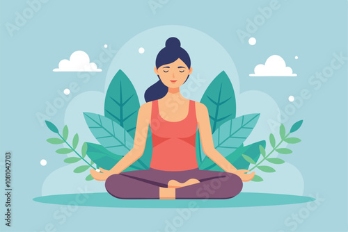 Женщина, сидящая в позе лотоса и практикующая медитацию, плоская векторная иллюстрация. Девушка занимается утренней йогой, отдыхает в экологически чистом домашнем уголке или делает дыхательные упражнения из мультфильма. Концепция осознанности