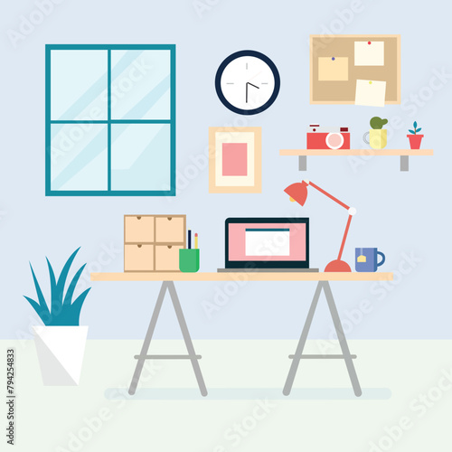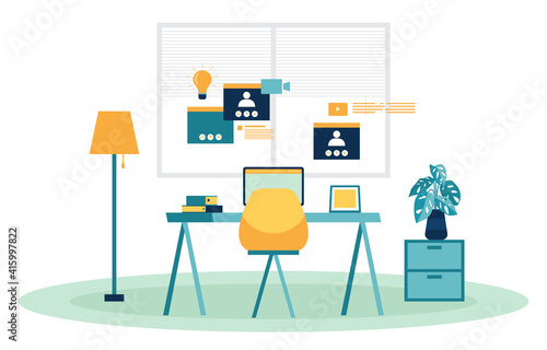 Женщина в маске разговаривает с врачом в клинике. Пациент записан на прием к врачу. Концепция векторной иллюстрации. Пустой офисный интерьер с компьютером на столе. Рабочее место в домашнем офисе.