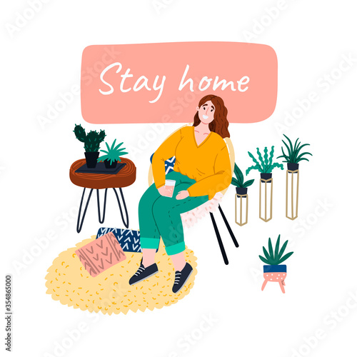 Женщина делает комфорт в своем доме. Иллюстрация векторной концепции уютного дома. Пуховое кресло-погремушка, уютный интерьер комнаты с комнатными растениями, расслабляющий образ жизни. Шаблон дизайна веб-сайта.