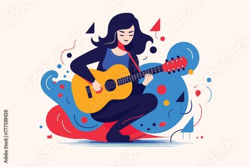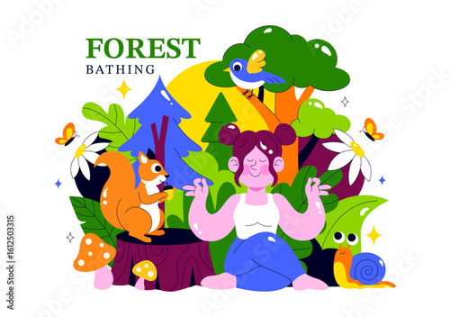 Женщина, медитирующая на природе, плоская векторная иллюстрация. Девушка, сидящая в позе йоги лотоса. Внимательность, расслабление, спокойствие, дзен, гармония.