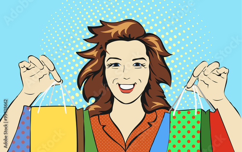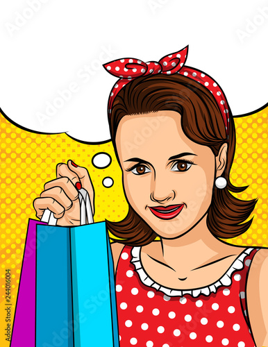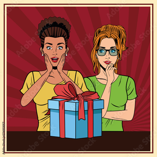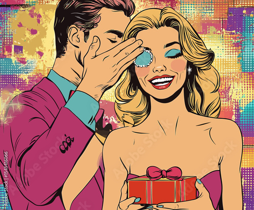Женщина преподносит подарок мужчине. Речевой пузырь в форме сердца. Векторная иллюстрация в стиле ретро-комиксов поп-арт. Красивая девушка с подарком на Рождество или день рождения.
