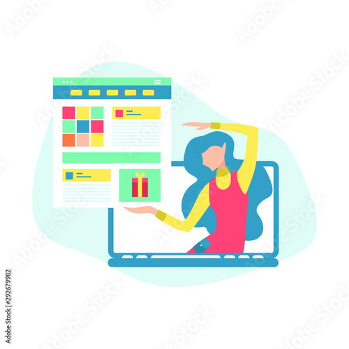 Женщина поставила новую банку на кухонную полку. Женщина смотрит кулинарное телешоу и готовит торт. Иллюстрация концепции. Векторный шаблон дизайна веб-сайта. Иллюстрация сайта целевой страницы.