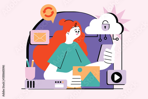Женщина положила старое платье в корзину для переработки. Модные тенденции и покупки в Интернете. Иллюстрация концепции моды. Векторный шаблон дизайна веб-сайта. Иллюстрация сайта целевой страницы.