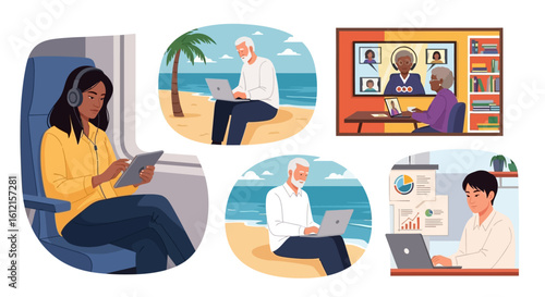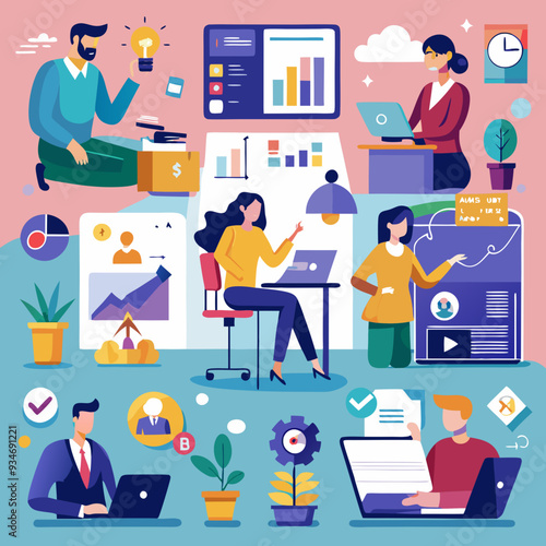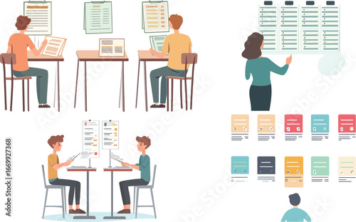 Женщина ищет дом в аренду онлайн. Набор векторных плакатов концепции недвижимости. Агент по недвижимости предлагает недвижимость на продажу. Выбор дома или квартиры по рейтингу. Договор ипотечного кредита.