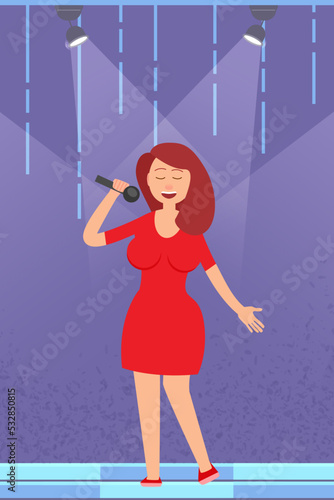 Векторная иллюстрация женщины-театральной или оперной певицы, поющей на сцене с красными занавесками. Дизайн в плоском стиле.