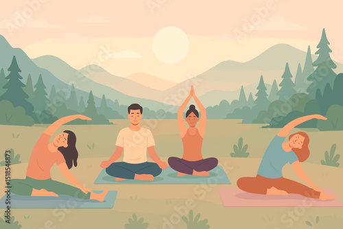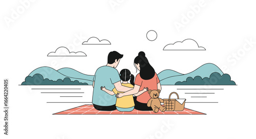 Женщина сидит на одеяле и читает книгу с горным пейзажем на заднем плане. Иллюстрация концепции летнего пикника на открытом воздухе. Векторный шаблон дизайна веб-сайта. Выходные и каникулы, путешествия на свежем воздухе.
