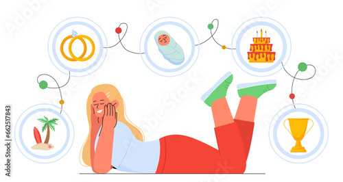 Женщина, сидящая на огромном календаре и проверяющая список дел с задачами, плоская векторная иллюстрация. Тайм-менеджмент, планирование, составление расписания.