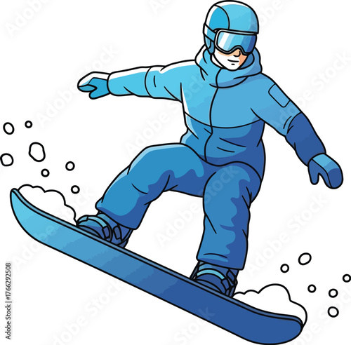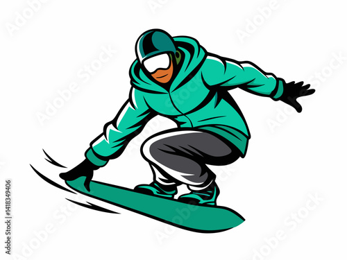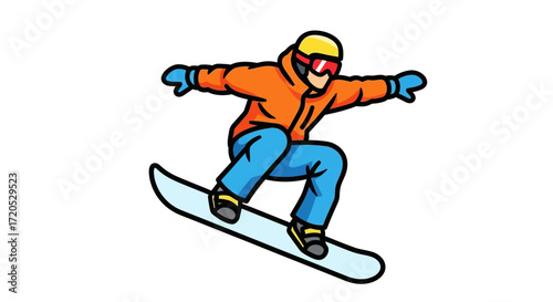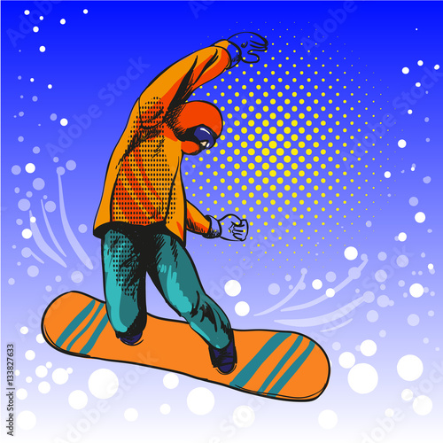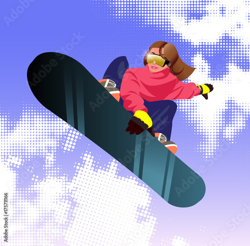 Женщина катается на сноуборде в горах. Векторная иллюстрация в стиле ретро поп-арта. Концепция зимних спортивных каникул. Девушка прыгает со сноубордом.