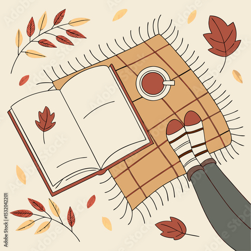Женщина сидит дома, пьет чай и читает книгу. Осеннее настроение рисованная векторная иллюстрация. Плакат осеннего сезона. Кленовый лист как закладка для дневника. Осенняя уютная пора.