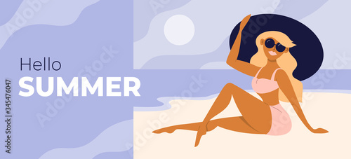 Красивая женщина в купальнике и солнцезащитной шляпе, безопасно загорающая с использованием солнцезащитного крема, плоская векторная иллюстрация. Солнцезащитный крем, крем для защиты от солнца. Процедура по уходу за кожей на летнем пляже.