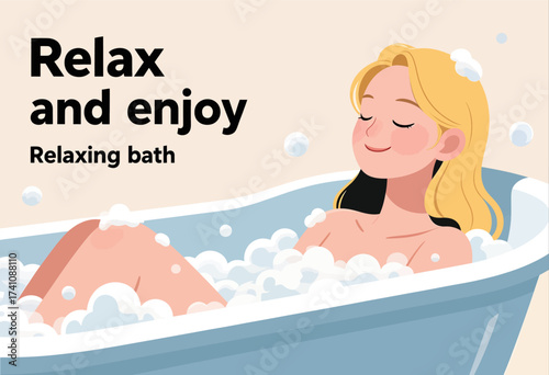 Женщина принимает ванну и моется. Иллюстрация косметической концепции красоты. Векторный шаблон дизайна веб-сайта. Женщина идет к деревенскому дому в лесу.
